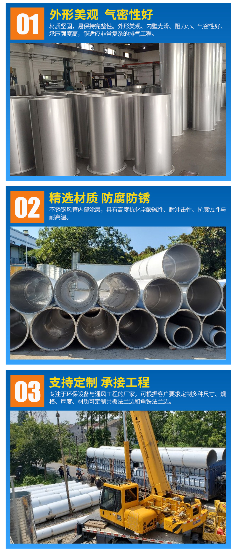 1、外形美觀、內(nèi)壁光滑、阻力小、氣密性好、承壓強(qiáng)度高,能適應(yīng)非常復(fù)雜的排氣工程。
