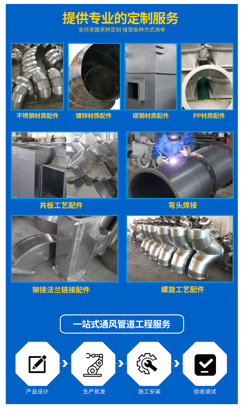 1、外形美觀、內(nèi)壁光滑、阻力小、氣密性好、承壓強(qiáng)度高,能適應(yīng)非常復(fù)雜的排氣工程。