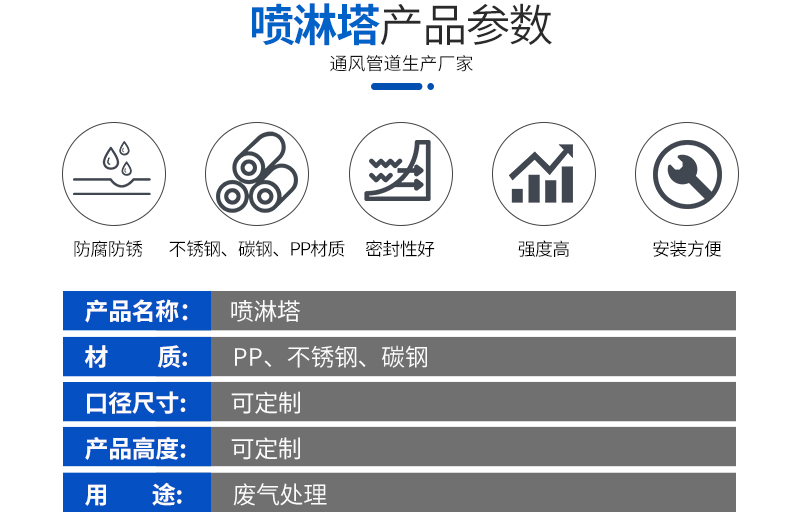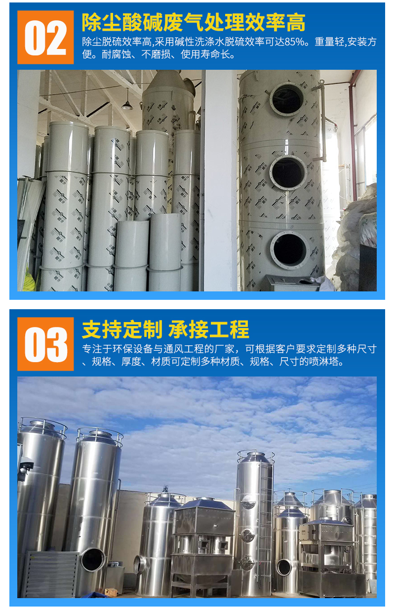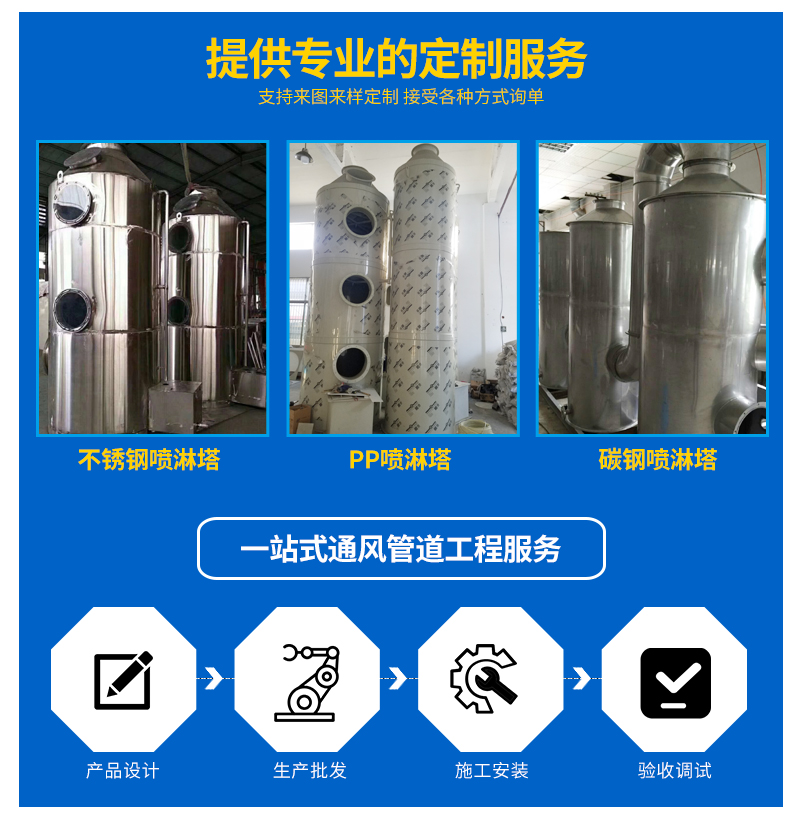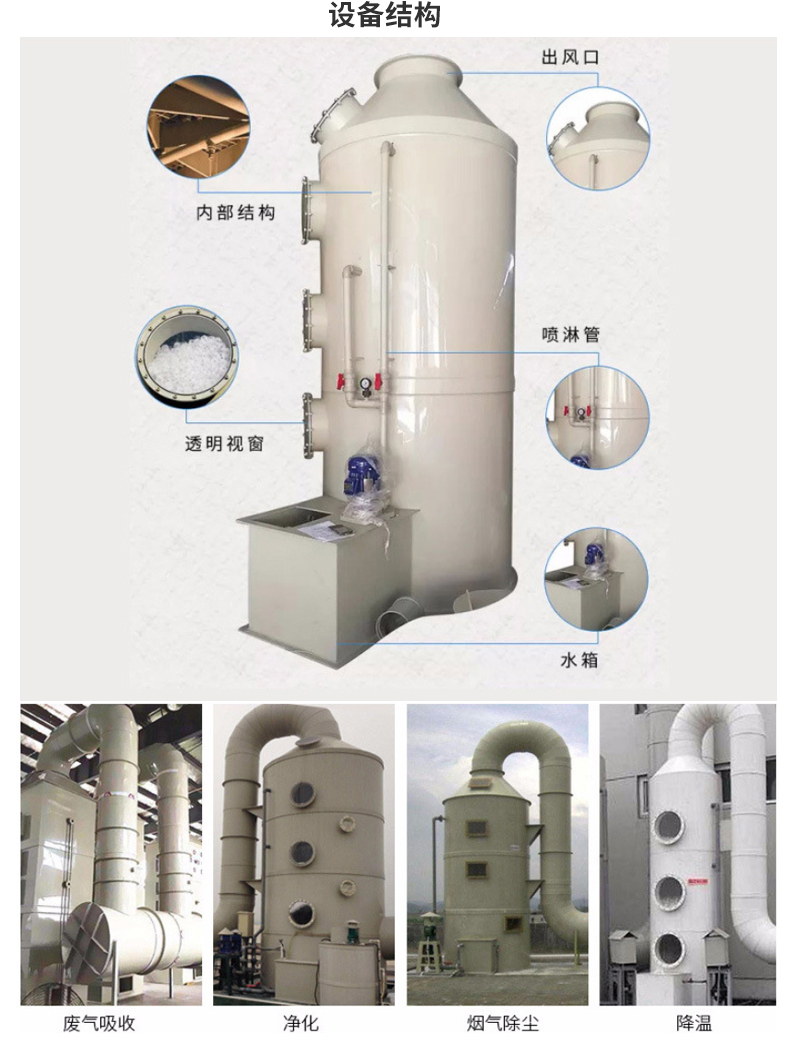 噴淋塔的用途:適用于化工、石油、半導體、醫(yī)藥、食品、印刷廠、冶金、實驗室、電鍍等行業(yè)生產(chǎn)工藝所產(chǎn)生的廢氣體的吸收、洗滌或凈化處理。