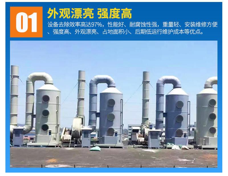 噴淋塔的特點:設備去除效率高達97%,性能好、耐腐蝕性強,重量輕、安裝維修方便、強度高、外觀漂亮、占地面積小、后期低運行維護成本等等優(yōu)點。